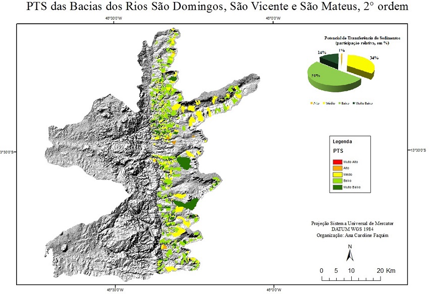 Em particular, as sub-bacias de 2ª ordem hierárquica apresentaram em sua maior abrangência PTS baixos, ou seja, possuem deficiência relativa para transportar sedimentos. Porém, entre as sub-bacias de 3ª ordem, verificou-se a ocorrência maior de PTS mais elevados, destacando a bacia de São Domingos, localizada a norte da área de estudo; seguida pela bacia do São Matheus. Entre as sub-bacias de 4ª ordem hierárquica, predominaram a ocorrência de PTS moderados a elevados, destacando novamente as bacias do S. Domingos e S. Mateus.