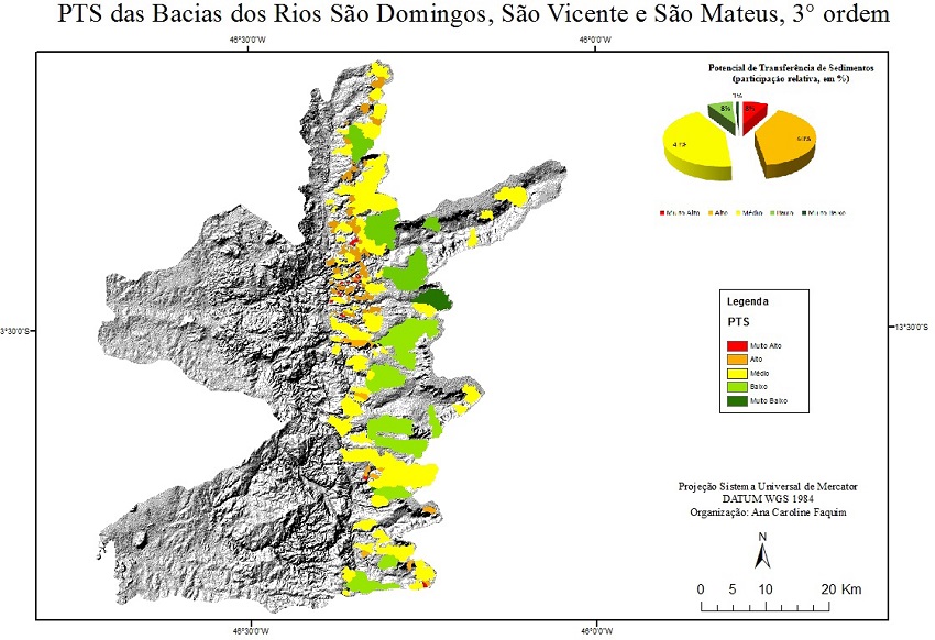 Percebe-se que, em área, as sub-bacias com Potencial de Transferência de Sedimentos (PTS) baixo são maiores que as com PTS alto. Isso ocorre, pois, as sub-bacias com PTS baixo localizam-se num setor mais aplainado da área de estudo (Figura 4), entre o sopé da Serra Geral de Goiás (leste da área) e os terrenos cársticos (oeste da área). Nessa porção intermediária aplainada, as sub-bacias apresentaram área maior que, na somatória de área, superam as sub-bacias com PTS mais elevado. Por outro lado, os gradientes dos rios principais das sub-bacias nessa porção aplainada são mais baixos, que aliado à área maior, influenciam para baixo os PTS, uma vez que essas variáveis são usadas para determinar o PTS da cada sub-bacia. Correlações entre as variáveis morfométricas, posição na compartimentação da paisagem e litologia serão investigadas em estudos futuros.