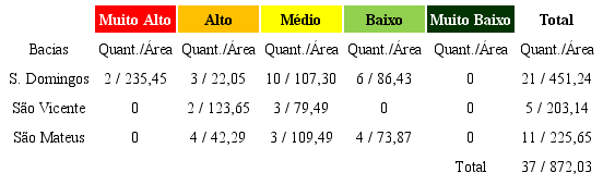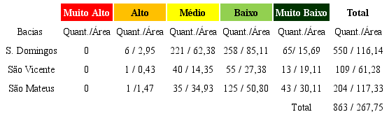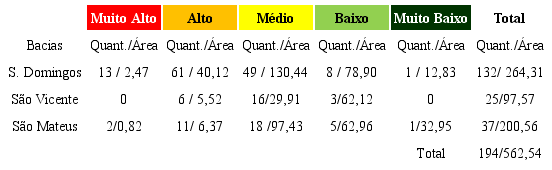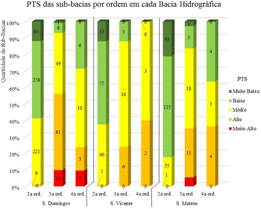 O desempenho geral da quantidade maior de sub-bacias com PTS médio a alto para toda área estudada também é verificado em particular para cada bacia hidrográfica investigada: São Domingos, São Vicente e São Mateus. Destaca-se a bacia do São Domingos que apresentou número maior de sub-bacias com PTS alto em relação às demais. Essa diferença provavelmente se deve às variáveis para determinação dos parâmetros morfométricos como área das sub-bacias e gradiente dos rios principais.