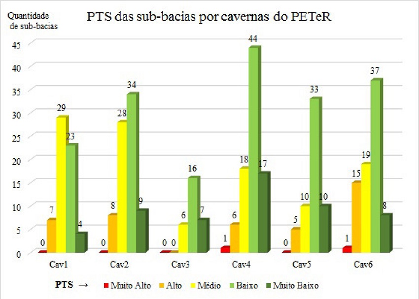 A caverna cuja rede de drenagem apresentou maior número de sub-bacias com PTS mais elevados foi a caverna do São Bernardo (Cav7), localizada na Bacia do Rio São Mateus, seguida da caverna Terra Ronca (Cav5) na mesma bacia (Figura 8). Posteriormente, em ordem decrescente de ocorrência de sub-bacias com PTS mais elevados, estão as cavernas do Bezerra (Cav2), do Angélica (Cav1), do Ribeirão Palmeiras (Cav6) e do São Mateus (Cav4).