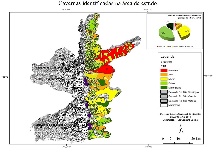 Dessa forma, este trabalho apresenta uma avaliação do Potencial de Transferência de Sedimentos (PTS) das bacias hidrográficas que aportam sedimentos ao Sistema Cárstico Terra Ronca, sendo calculado e analisado esse índice para as bacias dos rios São Domingos, São Vicente e São Mateus, as quais atravessam o PETeR, e, simultaneamente, suas cavernas que funcionam como exutório das bacias contribuintes quanto à potencialidade do aporte sedimentar.
