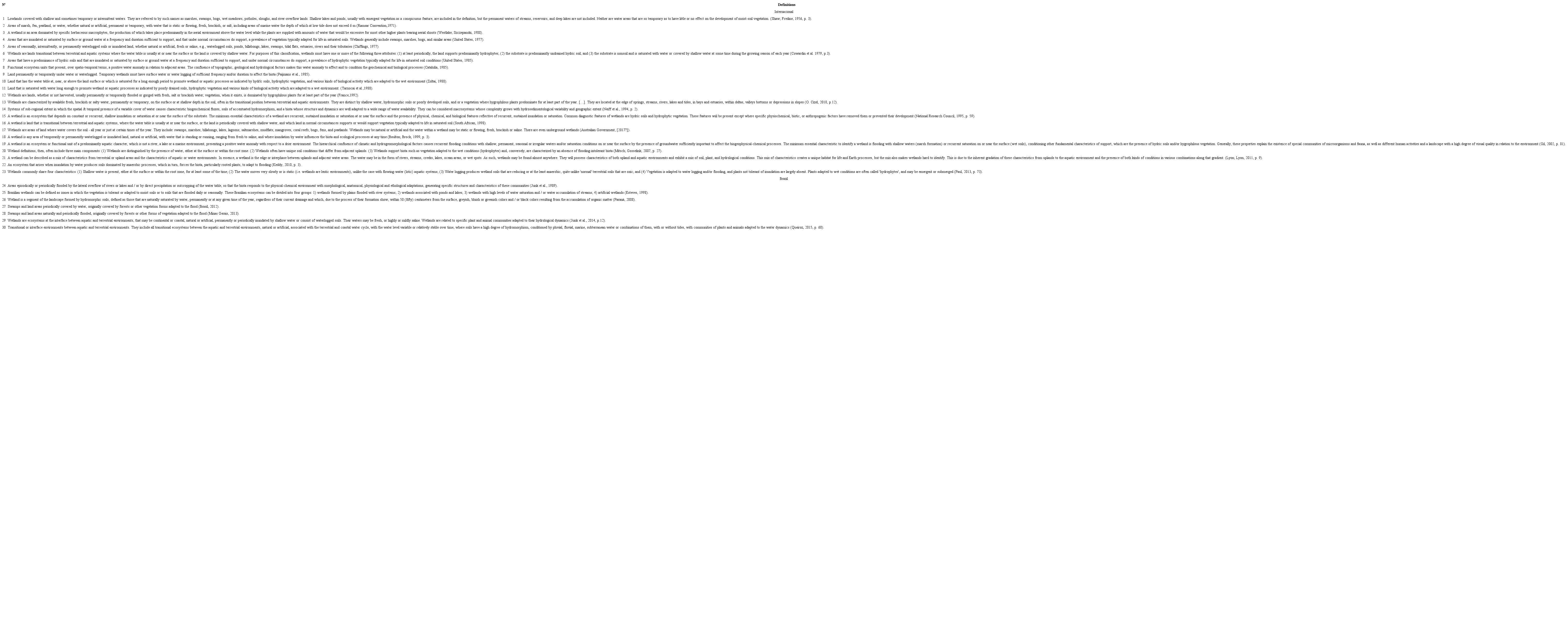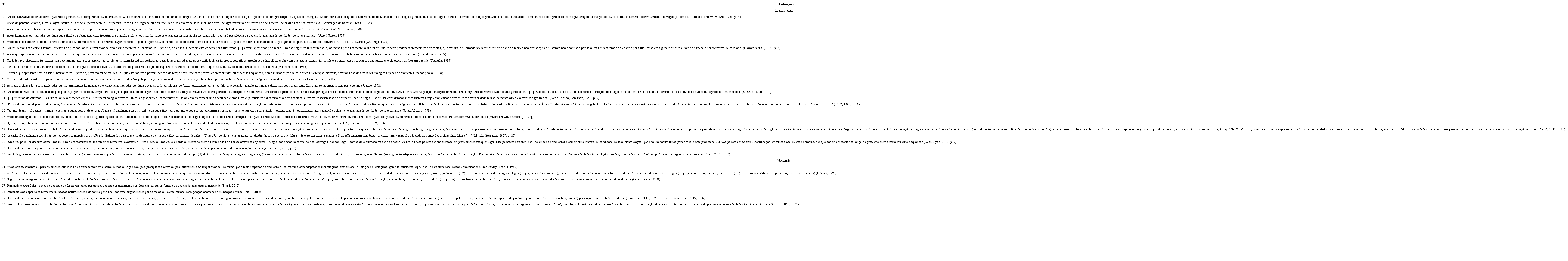 No hemisfério sul, o Departamento de Meio Ambiente australiano adotou uma definição (n° 17, Quadro 1) que inclui AUs subterrâneas, o que não está explícito nas outras definições. No seu relatório de manejo de AUs urbanas, um item comum na definição (n° 23, Quadro 1) é a presença de águas estagnadas ou com dinâmica lenta, mas nem todos os conceitos na literatura convergem para essa característica. Na legislação brasileira, a definição do Código Florestal (n° 27, Quadro 1) exclui as AUs permanentes e não esclarece se AUs são somente aquelas inundadas por cursos d’água. O INAU8 amplia o conceito (n° 29, Quadro 1) em contraposição ao Código, mas pode gerar dúvidas pelas diversas interpretações envolvidas no termo “interface entre ambientes terrestres e aquáticos” e pelo termo “solo hídrico” ser pouco usual no Brasil. Já a definição de Esteves (1998) (n° 25, Quadro 1) inclui como tipos de AUs, tanto áreas encharcadas quanto fitofisionomias.