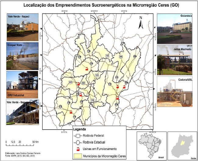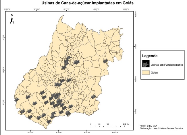 A maioria das usinas implantadas em Goiás está geograficamente instalada em um eixo centro norte-sul-sudoeste do Estado, como pode ser observado na Figura 2. Esta lógica de espacialização também está associada à malha viária implantada nesse eixo, com destaque para a BR-153 que corta o estado de Goiás, de norte a sul, o que facilita logística e financeiramente o escoamento e a circulação da produção.