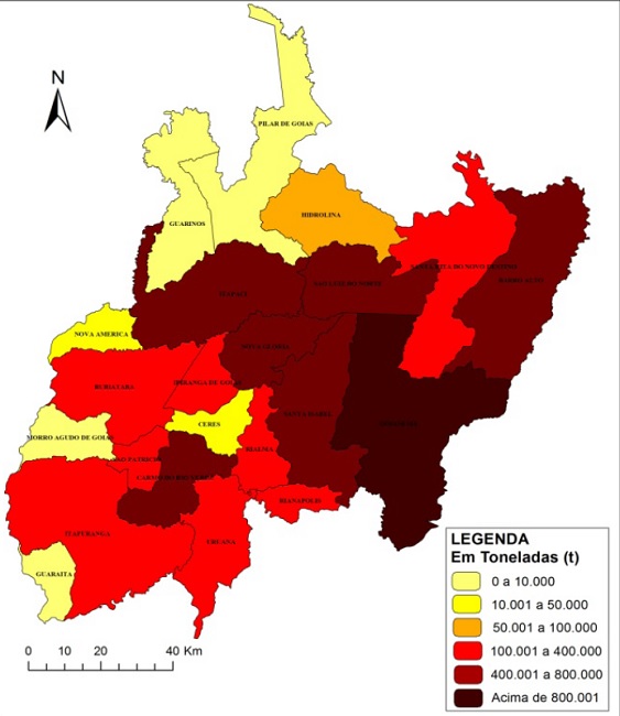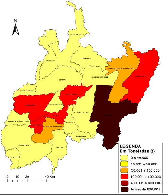 As figuras 4 e 5 mostram a espacialização da produção canavieira, em toneladas, na microrregião Ceres, para o ano 2000 (anterior ao Plano Nacional de Agroenergia) e, para o ano 2015, o qual fica evidente a apropriação da região para o uso canavieiro, não só para os municípios que possuem usinas implantadas, mas em grande parte dos municípios que constituem a região, que produzem a cana-de-açúcar para seu beneficiamento nos empreendimentos vizinhos.