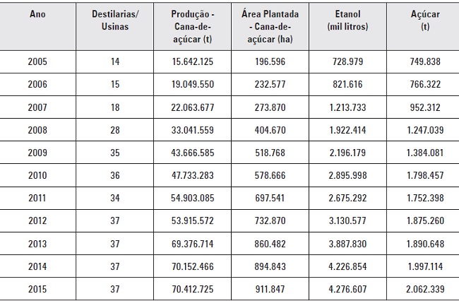 A Tabela 1 mostra os dados de produção canavieira, etanol e açúcar para Goiás, entre os anos 2005 a 2015. Por meio da observação dos dados, verifica-se que a quantidade de usinas mais que dobrou no período avaliado e a produção de cana, assim como a de etanol e açúcar, cresceu consideravelmente ao longo do tempo, salvo algumas pequenas oscilações. Destaca-se também que a área plantada com cana-de-açúcar vem crescendo ao longo do tempo, o que refuta a afirmação do setor no que se refere a não incorporação de novas áreas para o plantio de cana, mas sim um alto investimento na produtividade, o que aumentaria a produção, mas manteria a área plantada. Conforme verificado nos dados, a área plantada aumentou substancialmente.