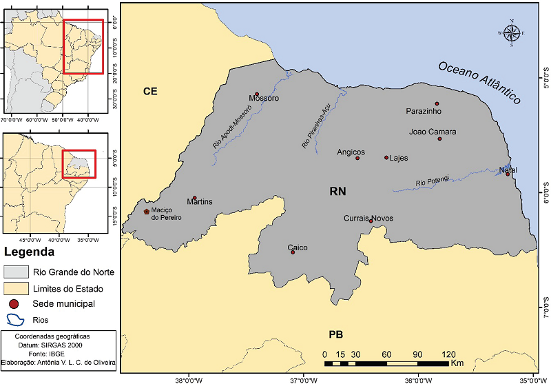 O estado do Rio Grande do Norte está localizado no extremo Nordeste do Brasil (Figura 2), aproximadamente entre as coordenadas 4° 50’ S e 6° 59’ S; e 34° 58’ O e 38° 34’ O. É um dos nove estados da região Nordeste do Brasil e limita-se a oeste com o Ceará, ao sul com a Paraíba e a norte e a leste com o Oceano Atlântico. Em 2013, a população estimada para o estado era de 3.373.959 habitantes (IBGE, 2013).