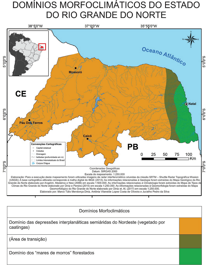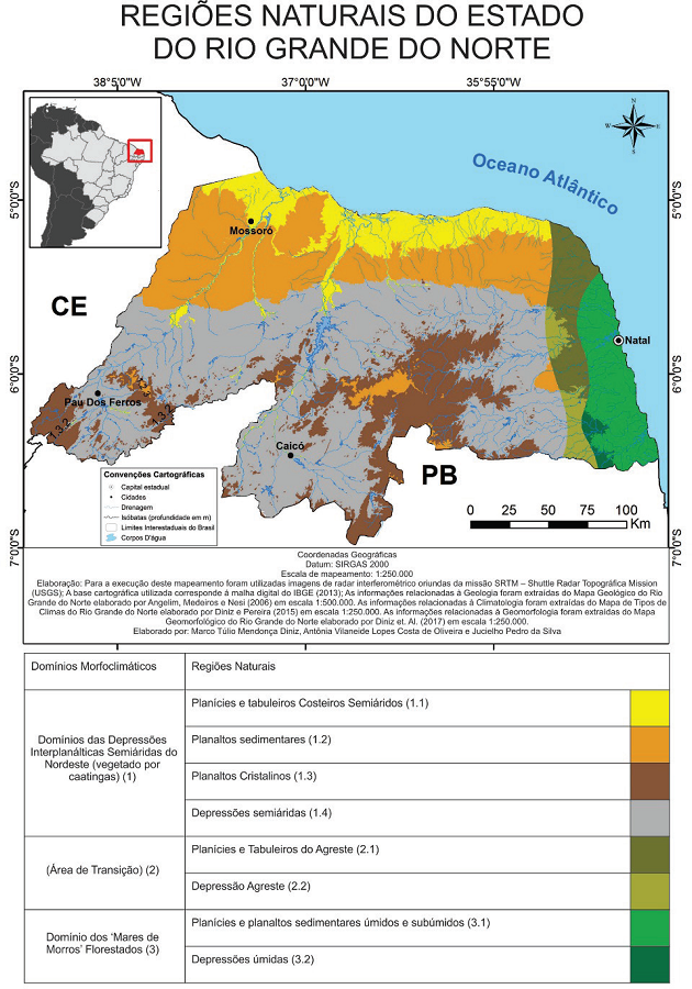Foram mapeados os domínios morfoclimáticos e fitogeográficos apontados por Ab’Sáber (2003) que ocupam o território potiguar, além de uma área de transição entre esses dois domínios, comumente denominada Agreste. O Domínio das Depressões Interplanálticas Semiáridas do Nordeste (vegetado por caatingas) ou Domínio das Caatingas foi mapeado em tons de cor amarelo, marrom e cinza e o Domínio dos “Mares de Morros” Florestados ou Domínio da Mata Atlântica teve tons de verde. Esses dois domínios foram separados com base na pluviometria média mapeada por Diniz e Pereira (2015). Já as regiões naturais são divisões desses domínios com base nas unidades geológicas de Angelim, Medeiros e Nesi (2006) e nos domínios morfoesculturais de Diniz et. al. (2017).