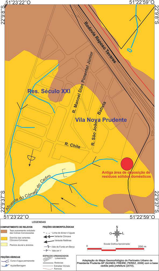 Além disso, ocorreu a deposição de resíduos sólidos domésticos (materiais úrbicos e gárbicos) em área adjacente ao loteamento durante a década de 1980 (Mazzini, 1997), em área de feição erosiva próxima a uma nascente, cujo curso d’água direciona-se para a área da planície tecnogênica estudada. A Figura 2 representa os compartimentos do relevo do local, bem como a localização da antiga área de deposição dos resíduos sólidos domésticos, que foram aterrados e, posteriormente, conforme informação de Mazzini (1997), no local foi instalado o estacionamento do Recinto de Exposições da cidade.