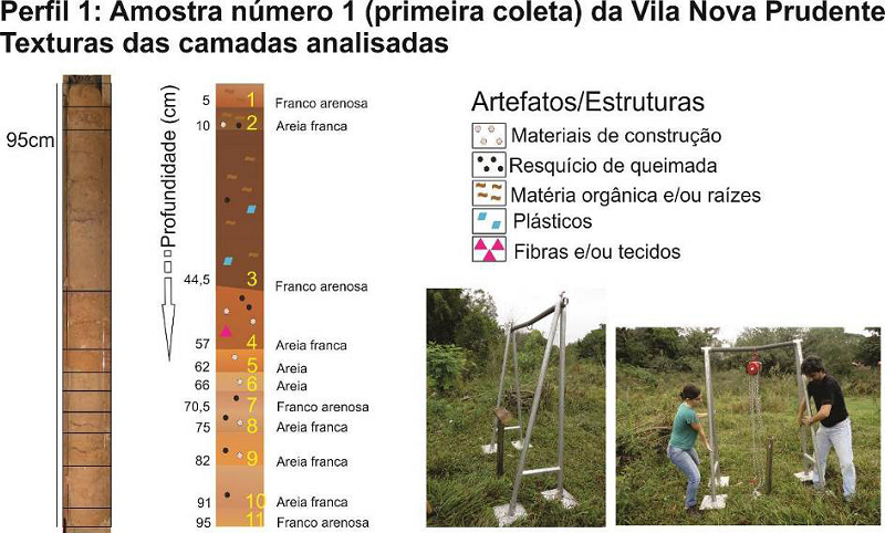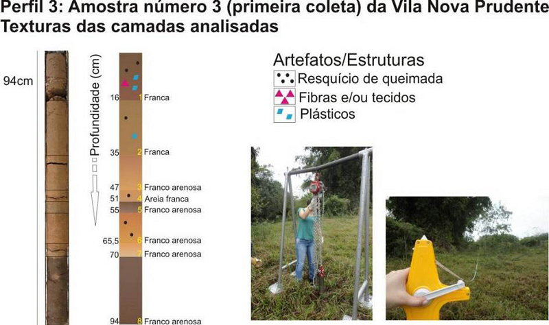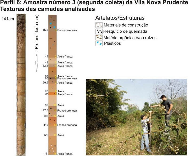 As coletas das amostras das deposições tecnogênicas foram executadas com a finalidade de reconhecimento das camadas sedimentares e materiais presentes, através da visualização das características físicas das amostras após a abertura dos amostradores nas dependências da Universidade Estadual Paulista “Júlio de Mesquita Filho”, Faculdade de Ciências e Tecnologia (FCT/UNESP). Em laboratório, cada uma das 14 amostras coletadas com tubos de ferro de três polegadas, penetrados à percussão na superfície, passaram por análise visual para reconhecimento das camadas de deposição e suas características gerais, como cor, textura aparente e materiais presentes, manufaturados e naturais. Após essa etapa inicial, as camadas sedimentares passaram pela análise granulométrica, de acordo com EMBRAPA (1997), para o estabelecimento das porcentagens das frações areia, silte e argila, cujos valores foram transpostos para o Diagrama de Classes Texturais proposto pelo United States Department of Agriculture (USDA., 1951), presente em Lemos e Santos (1996), identificando-se as texturas correspondentes.