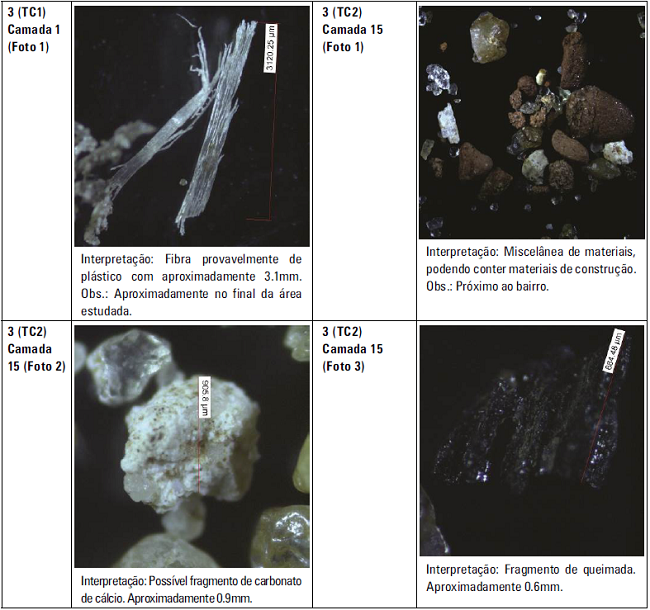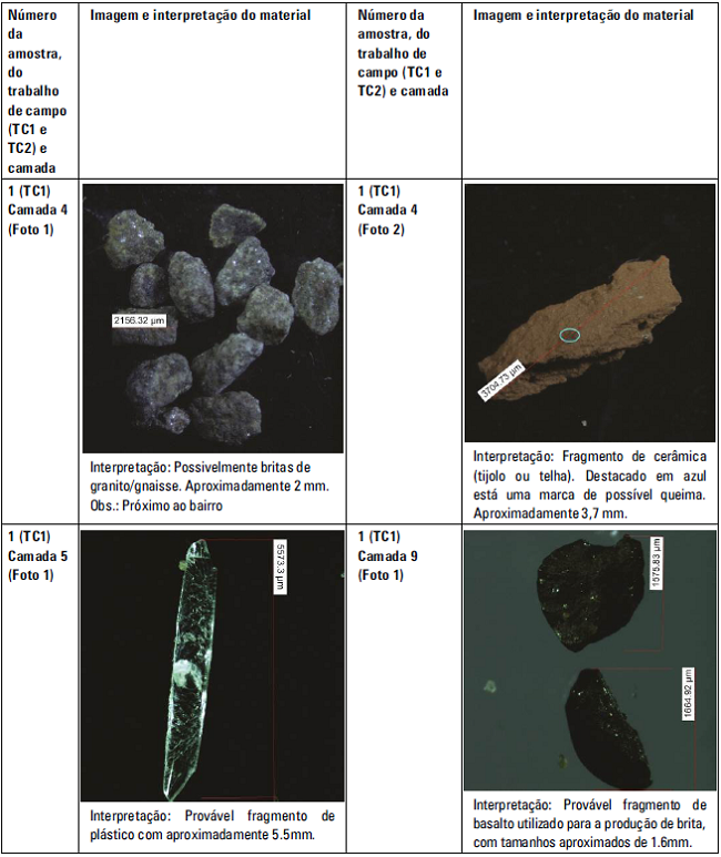 A microscopia é um procedimento que ajuda na identificação dos materiais tecnogênicos, como agregados da construção civil e cerâmicas. Como exemplo, presente no Quadro 1, o fragmento fotografado na amostra número 1 (TC13), na camada número 4 (Foto 2), refere-se, provavelmente, a um fragmento de cerâmica, com uma marca de queima destacada no meio.