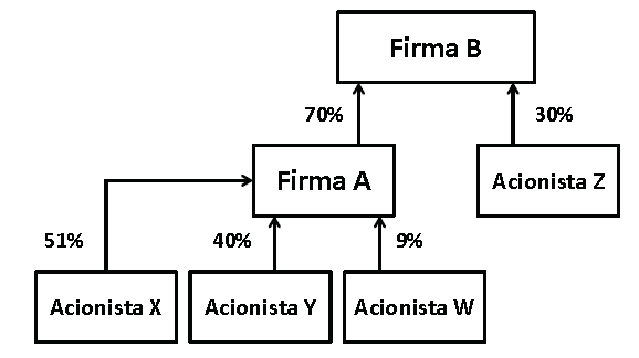 Os cálculos de participações direta e indireta basearam-se na metodologia desenvolvida por Da Silva (2002). O método supera a dificuldade da metodologia internacional que considera para o cálculo do percentual de controle o menor percentual na cadeia entre o acionista último e a empresa que se está observando. Nessa abordagem, a soma dos percentuais de controle indireto de mais de um acionista pode ultrapassar 100%. Da Silva (2002) também usa o critério do menor valor na cadeia de direitos de voto, porém limita o somatório dos menores valores à participação direta na cadeia de direitos de voto. O autor usa como exemplo a situação descrita na Figura 1. As participações na propriedade seguem o critério da multiplicação dos percentuais. Assim, X tem 35,70% (51% x 70%), Y tem 28% (40% x 70%), W tem 6,30% (9% x 70%) e Z tem 30%. Os percentuais de participação no controle serão: 70% para X, pois esse tem o controle de A, que detém os 70%; Y e W indiretamente ficam com 0% de B, e Z tem direta e indiretamente 30% do controle de B. A soma dos percentuais de controle é de 100%, e não os 130% que se encontraria com o método do menor percentual da cadeia de participações (51% de A + 40% de Y + 9% de W + 30% de Z).