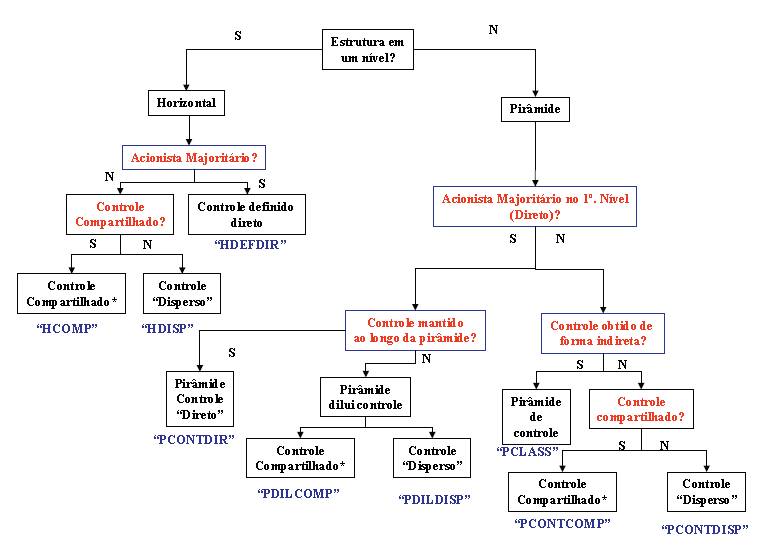 Como o presente trabalho tem como objetivo principal entender o que determina, no caso brasileiro, uma dada estrutura de propriedade, foi criado um critério inicial de classificação. Os diferentes tipos de organização da estrutura de propriedade foram divididos em grupos de acordo com a lógica descrita na Figura 2. O critério separa as empresas de acordo com o controle (se há acionista majoritário, se o controle é compartilhado por até cinco acionistas ou disperso em mais do que cinco acionistas), com a estrutura (se é piramidal ou horizontal) e se o controle é diluído ou concentrado ao longo da cadeia de participações.