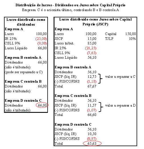 A opção de distribuir parte do lucro como Juros Sobre Capital Próprio (JSCP) permite à empresa que o distribui contabilizar o valor pago como despesa financeira, abatendo-o da base de cálculo do imposto de renda (IR). O valor máximo a ser distribuído é $15, supondo uma taxa de juros de longo prazo igual a 10% (TJLP x Capital Próprio = 10% x $150 = $15). Para o acionista que recebe o JSCP, há retenção de IR na fonte de 15%; no exemplo B, recebe $12,75 ($15,00 - $2,25), e não os $15 integralmente. Além desse valor, B recebe $56,10 do lucro de A como dividendos. O JSCP recebido por B é contabilizado como receita financeira, mas, ao repassar a C, ele também pode ser distribuído como JSCP, anulando os efeitos sobre o IR de B. Além disso, o imposto que já foi retido na fonte pela empresa operacional que gerou o lucro também pode ser repassado. Dessa forma, o repasse aconteceria integralmente sem nenhuma redução. A redução ocorre devido ao imposto que incide sobre a receita financeira. A receita financeira normalmente não paga PIS e COFINS, mas para os JSCP há dispositivo especial estipulando o pagamento. PIS e COFINS somam 9,25%, e assim o valor líquido recebido por B e repassado a C é de $11,57. Considerando os dividendos recebidos, o valor total recebido por B é de $67,67.