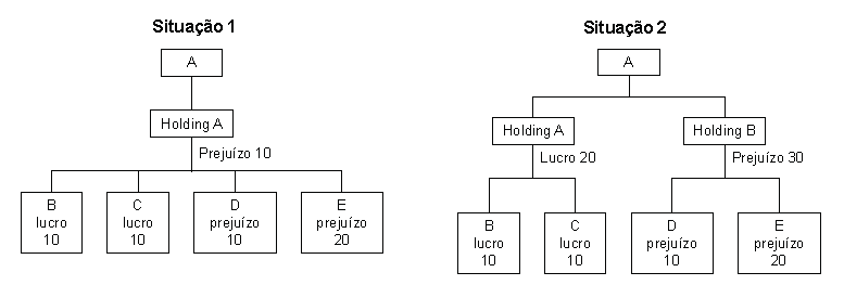 A criação de holdings pode, entretanto, ser vantajosa para a distribuição de lucros quando em estruturas diversificadas em vários negócios há prejuízos em alguns. Na Figura 4 na Situação 1 o acionista A terá que contabilizar o prejuízo de $10, mas na Situação 2 a criação de mais uma holding permite a ele receber o caixa da distribuição do lucro de $20 por meio da holding A, e em separado contabilizar o prejuízo de $30 recebido da holding B. Quando um novo negócio é iniciado, intensivo em capital e com período de maturação longo, é comum colocá-lo na estrutura sob uma holding até que ele comece a dar lucros, quando então pode ser incorporado à estrutura existente, eliminando a holding criada e um nível da estrutura de propriedade.