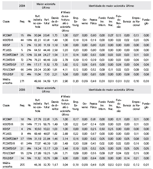 O modelo de classificação apresentado na Figura 2 foi aplicado às amostras de 2004 e 2006. A Tabela 1 apresenta algumas características dos grupos. A frequência de pirâmides e estruturas horizontais na amostra não se altera muito de 2004 para 2006, sendo a estrutura horizontal cerca de 23% das amostras. As classes em que há um acionista majoritário e essa condição se mantêm ao longo da estrutura (HDEFDIR e PCONTDIR), e tiveram sua representatividade reduzida de 2004 para 2006 (43% para 38% na soma das duas classes em 2004 e 2006 respectivamente).