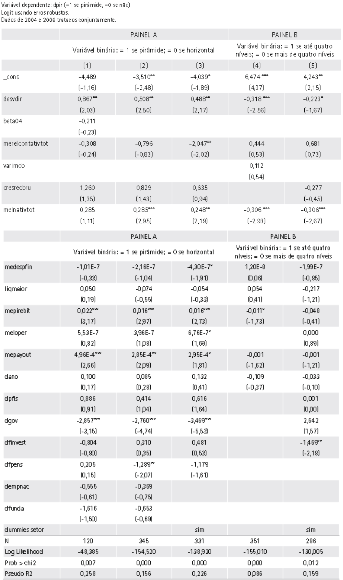 A seguir, as características das estruturas são avaliadas por meio de modelos logit, com resultados reportados na Tabela 2. As estruturas foram separadas de acordo com dois critérios: o primeiro separando pirâmides de estruturas horizontais (Painel A) e o segundo separando as estruturas com muitos níveis das com poucos níveis (Painel B).