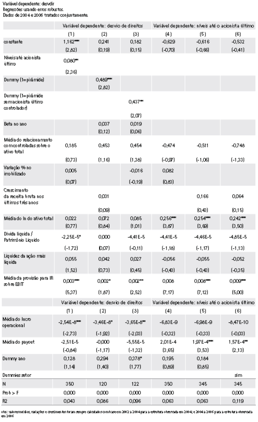 Quando a quantidade de níveis é substituída pelas dummies que identificam pirâmides e pirâmides sem acionista último com mais de 50% dos votos, essas mostram relação positiva com significância estatística maior do que a quantidade de níveis. Isso mostra que a estrutura em pirâmide potencializa os desvios de direitos.