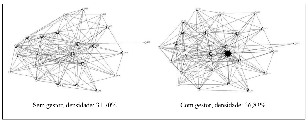 A densidade mensura o nível de interligação dos atores de uma rede (Scott, 2000). No caso das redes interorganizacionais, a medida da densidade é um indicador do nível de coesão de seus participantes, que, por sua vez, é um fator relevante na realização de ações conjuntas e na resolução de conflitos do grupo (Granovetter, 1985). O gestor é decisivo para manter e ampliar a coesão da rede, pois a ele cabe o papel de organizar e intensificar os relacionamentos. Na Rede Centersul, a transformação da estrutura autogerenciada para uma estrutura sustentada por uma entidade administrativa independente fez com que esse papel do gestor fosse ressaltado. No intuito de analisar se a transformação estrutural afetou a coesão da Rede Centersul, foram comparadas as densidades de rede com e sem a participação do gestor.