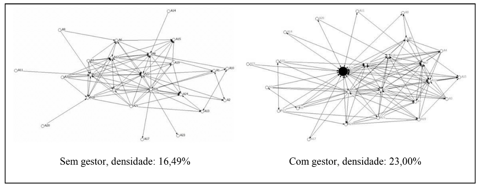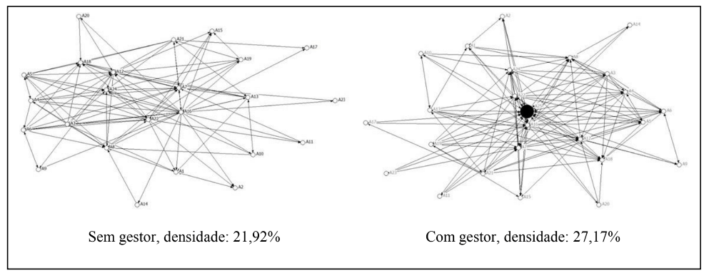 Resultados semelhantes foram encontrados na ARS quando perguntado “em quem você confia?”. A densidade da rede sem a inclusão do gestor, nessa questão, tem o valor de 0,2192, enquanto que a densidade com a sua inclusão alcança um valor superior de 0,2717. A comparação das densidades da Rede Centersul em relação à percepção da confiança entre seus atores, com e sem a presença do gestor, é apresentada graficamente na Figura 3. Pode-se afirmar, portanto, que a dinâmica estrutural da gestão da Rede Centersul tem afetado o nível de confiança entre os associados, visto que os laços foram ampliados de 121 para 163. Esses resultados corroboram os estudos que defendem a coesão da rede social e a repetição dos relacionamentos como geradores de confiança (Locke, 2003; Granovetter, 2005).