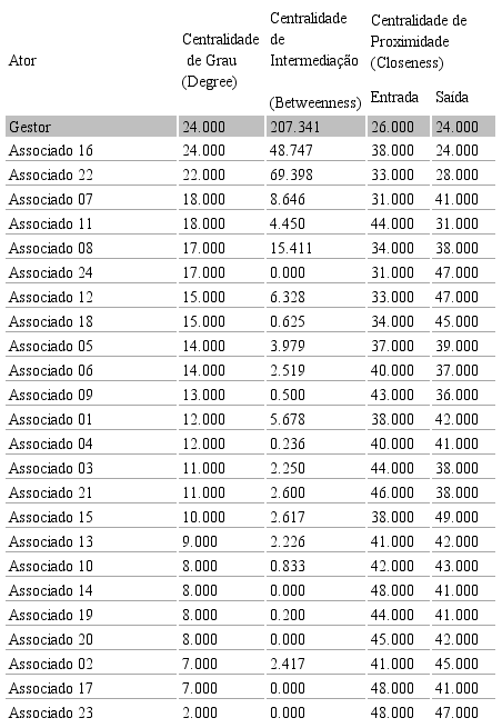 No que se refere à centralidade de grau (Degree), medida pelo número de laços diretos que um ator tem com os demais (Hanneman e Riddle, 2005), os resultados da ARS apontam gestor da rede como o ator mais central. Como pode ser observado na Tabela 1, a sua centralidade de grau tem o valor de 24.000, ou seja, esse gestor possui uma ligação direta com todos os 24 associados da Rede Centersul. A medida de centralidade de grau se relaciona ao potencial de comunicação dentro na rede (Freeman, 1979); assim, as informações importantes que chegarem ao ator central serão mais facilmente disseminadas. No caso da Rede Centersul, como o ator central da rede social é o gestor, seu papel como o arquiteto da cooperação (Snow e Thomas, 1993; Pollock et al., 2004) é facilitado por sua posição estrutural na rede.