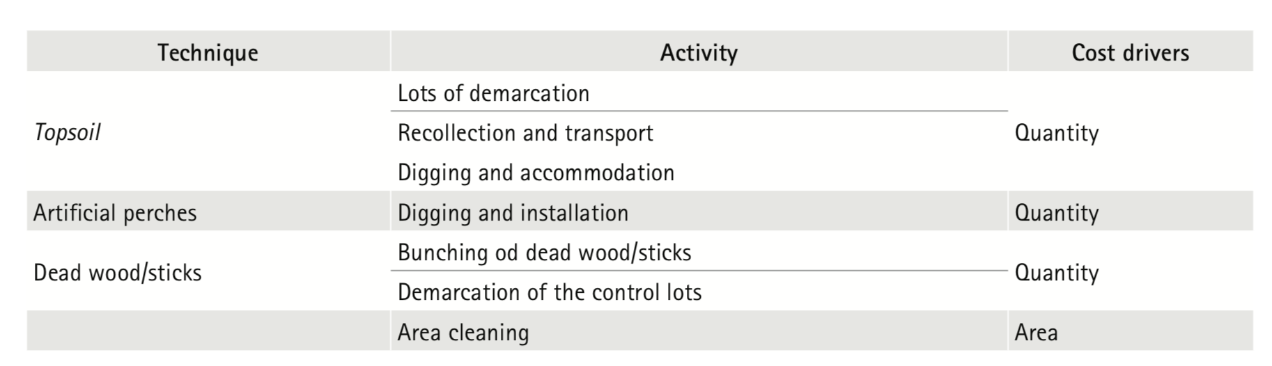 As the nucleation technique is composed of specific activities developed in the moment of implementation of the technique, the identification and gathering of information for the purpose of costs estimating are easily undertaken. However, knowledge about estimating costs methodology is required in order to allocate, identify and segment the activities for the purposes of collecting data of concerning values (Nakagawa, 2000). We identified two cost drivers in the implementation of activities associated to the nucleation techniques: the quantity and the area (Table 1).