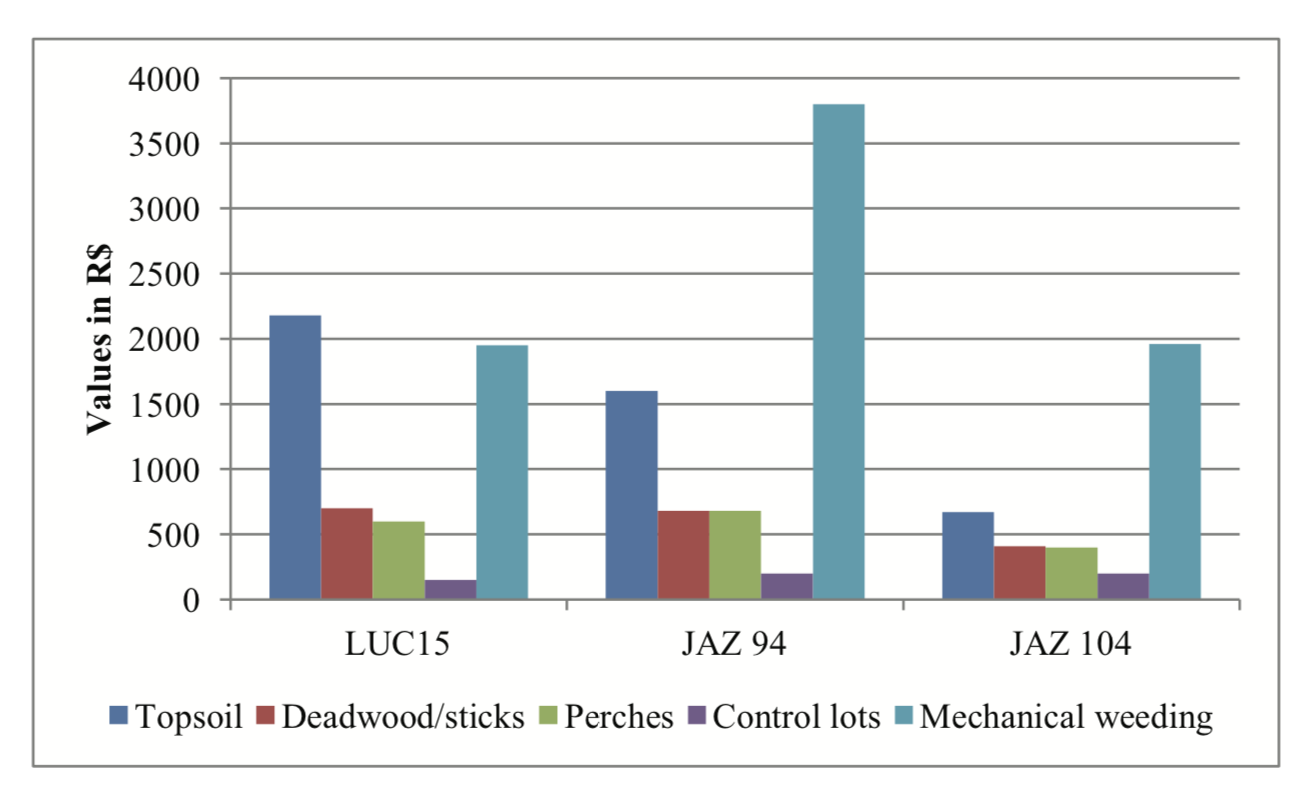 Among the studied nucleation techniques, topsoil was the one that consumed more financial resources, followed by dead wood/sticks and artificial perches. The costs are related to the amount of parcels installed, the Direct Labor and Indirect Labor hours consumed, the time using materials and equipment, the availability of natural resources in the studied clearing and the land slope.