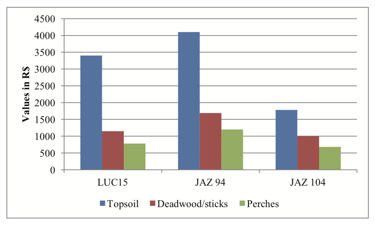 The values found by Bechara (2006) were inferior compared to those obtained in the implantation of topsoil, dead wood/sticks and artificial perches at the BOGPM. The variation is explained by the variable cost analysis, the region of deployment and the use of available natural resources. The incidence of costs on the Direct Manpower at the BOGPM is at least three times the one used by Bechara (2006). The branches or trees trunks used for the windrowing of dead wood/sticks and artificial perches were made of Eucalyptus, different from the natural resources used at the BOGPM.