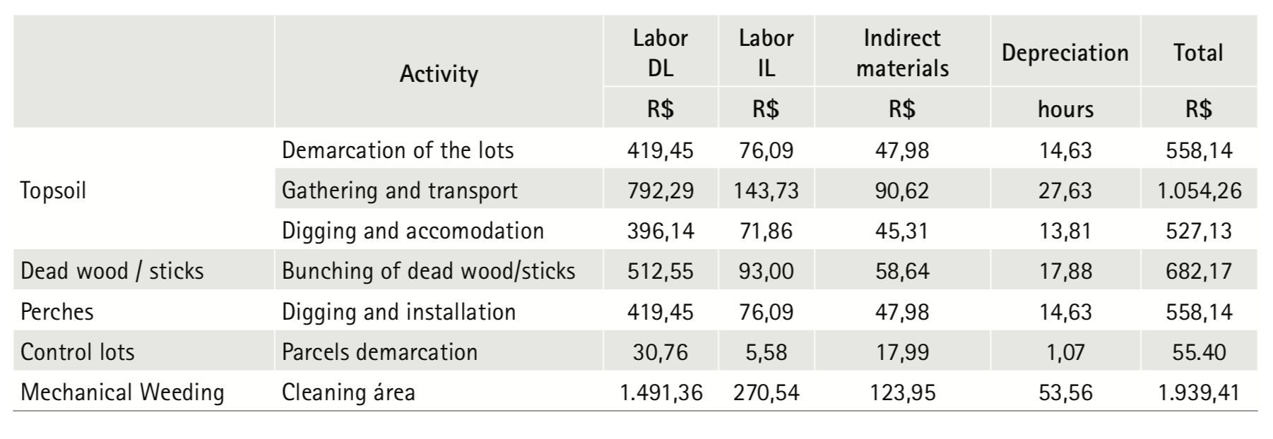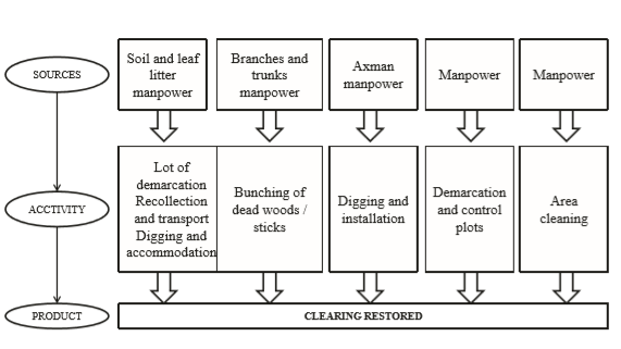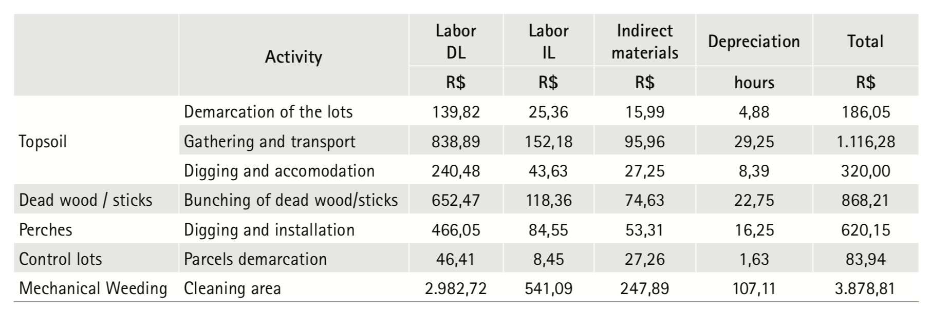 The direct materials of the nucleation techniques were identified at the time of implementation of the experiment in the degraded area. Materials are directly applied to obtain the final product (Santos, 2009). In the particular case of nucleation, the natural resources (soil with leaf litter, branches, trunks, trees) compose the direct materials and do not have reference values to be considered in this study as direct material cost.