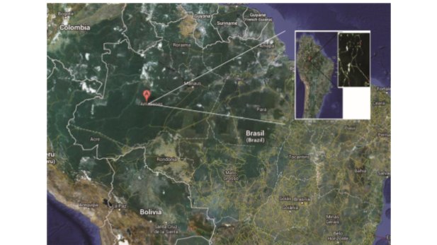 The study was conducted at the Geologist Pedro de Moura Operation Base – BOGPM, in Coari, state of Amazonas, Brazil, located at coordinates 04º53’S and 65º 11’W (Figure 4). The region is comprised of Rain Forest ombrophilous in dystrophic Ultisol, with closed canopy and dense predominantly fine trees (10–20 cm DAP), straight trunks, large globe-shaped treetops, with low diversity of epiphytes and lianas (Whitmore, 1990; Lima-Filho et al., 2001). The climate is “Afi” (Koppen, 1948), equatorial hot and humid with abundant rainfalls from September to April and dry from May to August, with annual rainfall average superior to 250mm and annual temperature average of 26º Celsius (Oliveira et al., 2008).