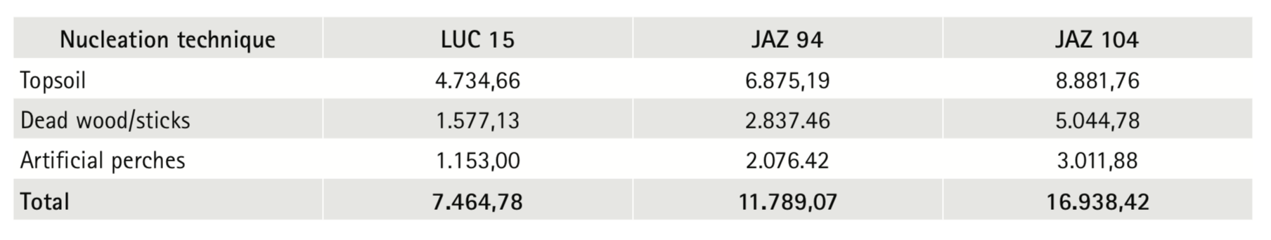 The costs of these new ideas have no influence on the increase of nucleation techniques values. The costs would be concentrated on activities achieved through an economic analysis conducted in this study to topsoil, dead wood/sticks and artificial perches nucleation techniques.
