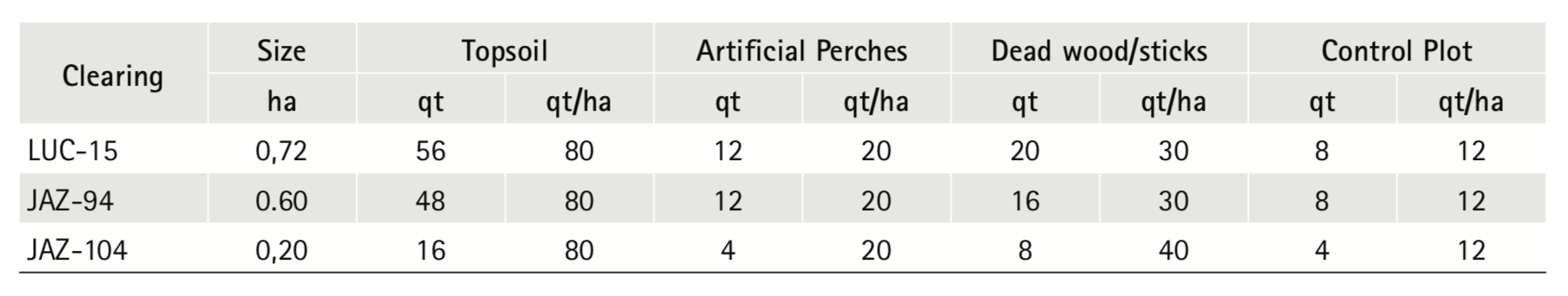 In this study, three nucleation techniques for the restoration of clearings as topsoil, dead wood/sticks and artificial perches were evaluated. The topsoil consists in moving a layer of the forest soil, rich in seeds and soil biota to the impacted area (Akintorinwa and Adesoji, 2009).