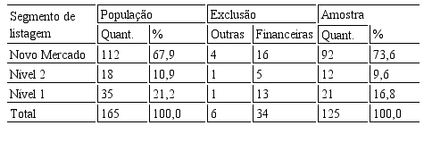 Dentre as 165 empresas listadas nos níveis diferenciados de governança corporativa da BM&FBovespa, foram analisadas as práticas de divulgação de 125 delas, conforme Tabela 1.