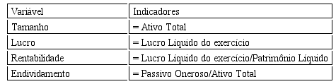 Após coletados e catalogados os dados, procurou-se verificar a associação entre a variável Nota de Disclosure de cada empresa e as respectivas características, sendo elencadas variáveis referentes a tamanho e desempenho, uma vez que as “melhores” empresas são incentivadas a adotar maior disclosure para atender aos investidores e garantir menor custo de capital e menor risco. Desse modo, tomando-se por base estudos anteriores, foram selecionadas as variáveis tamanho, lucro, rentabilidade e endividamento, sendo utilizados os indicadores explicitados no Quadro 1.