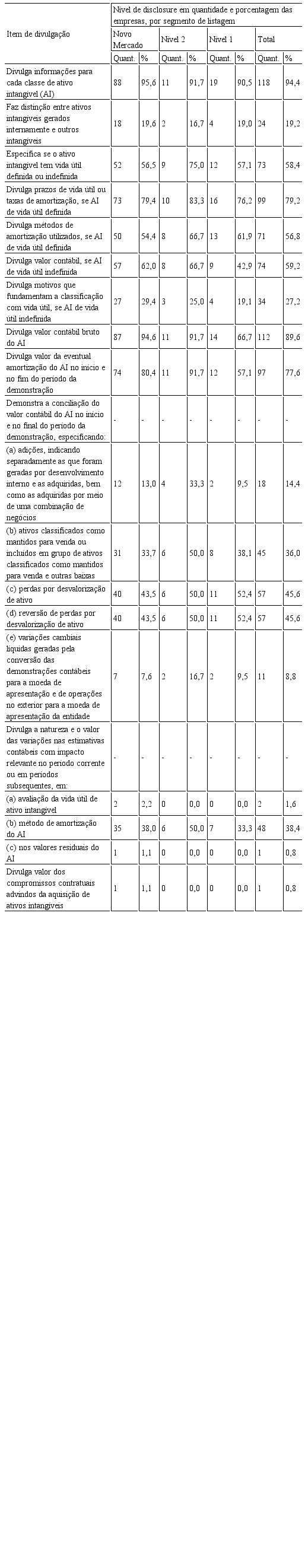 Em análise preliminar, verificou-se que considerável número de empresas listadas nos níveis diferenciados de governança corporativa da BM&FBovespa não vem cumprindo as orientações de divulgação relativas aos ativos intangíveis. Vale destacar que duas empresas não explicitaram, em notas explicativas, nenhum dos dezoito elementos de disclosure contidos na métrica definida a partir do CPC 04.