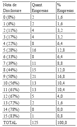 Constata-se que as três Notas de Disclosure de maior frequência foram 9, 5 e 8 divulgadas por, respectivamente, 21 (16,8%), 16 (12,8%) e 15 (12%) empresas. Essas três notas reuniram 41,6% do total de empresas analisadas. A nota 14 não chegou a ser obtida por nenhuma das empresas em análise, enquanto a nota 15 foi obtida por apenas uma empresa, e as notas 0, 1 e 13 foram alcançadas por duas empresas cada uma.