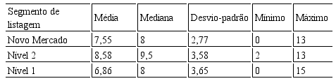 Diferentemente do esperado, verificou-se que, na média, as empresas listadas no Nível 2 foram as que mais observaram as orientações normativas, apresentando, para a variável Nota de Disclosure, média 8,58. As notas das empresas do Novo Mercado registraram média 7,55. Com relação à variabilidade das notas, verificou-se comportamento semelhante entre as empresas do Nível 2 e as do Nível 1, com desvios-padrão 3,58 e 3,65, respectivamente. As companhias do Novo Mercado registraram menor variabilidade nas notas, com desvio-padrão 2,77.