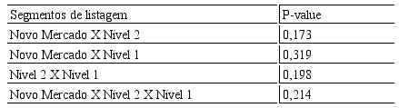 Além disso, era esperado que as empresas do Novo Mercado, que apresentam melhor estrutura de governança, apresentassem maiores níveis de disclosure dos ativos intangíveis. Contudo, a aplicação dos testes de diferenças entre médias revelou não haver diferenças estatisticamente significantes entre as médias das Notas de Disclosure alcançadas pelas empresas listadas nos níveis diferenciados de governança corporativa da BM&FBovespa.