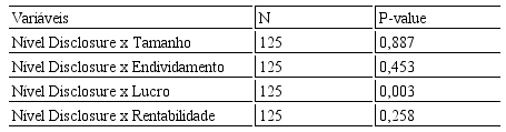 A análise da Tabela 6 revela que somente para a variável lucro pôde-se inferir relação com a variável Nota de Disclosure, uma vez que foi observada significância estatística em nível satisfatório. Quanto às variáveis tamanho, endividamento e rentabilidade, não se visualizou qualquer associação com a variável Nota de Disclosure.