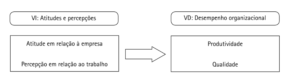 O objetivo desta pesquisa é investigar a relação entre as percepções e as atitudes dos funcionários em relação ao trabalho e à empresa, e o desempenho organizacional, tomado em termos de produtividade e qualidade. Assim sendo, as variáveis independentes são percepções e atitudes, as variáveis dependentes são produtividade e qualidade.