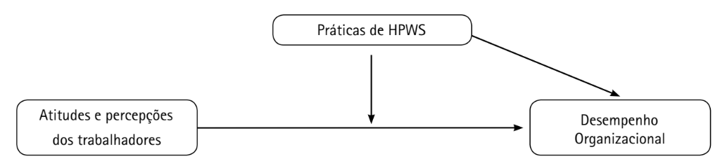 Outra possibilidade de estudo é estudar o efeito moderador (Baron e Kenny, 1986) das práticas de HPWS na relação entre atitudes e percepções dos trabalhadores e o desempenho organizacional, conforme demonstrado na Figura 3. Essa relação poderia ser feita em uma mesma organização em dois momentos, antes e após a implementação de práticas de HPWS. Ou então poderiam ser realizados estudos em várias organizações, com comparação dos resultados das que possuem práticas de HPWS com as que não as possuem. Nesse caso, seria investigado se as práticas de HPWS atuam na força da relação entre as atitudes e as percepções dos trabalhadores e o desempenho organizacional.