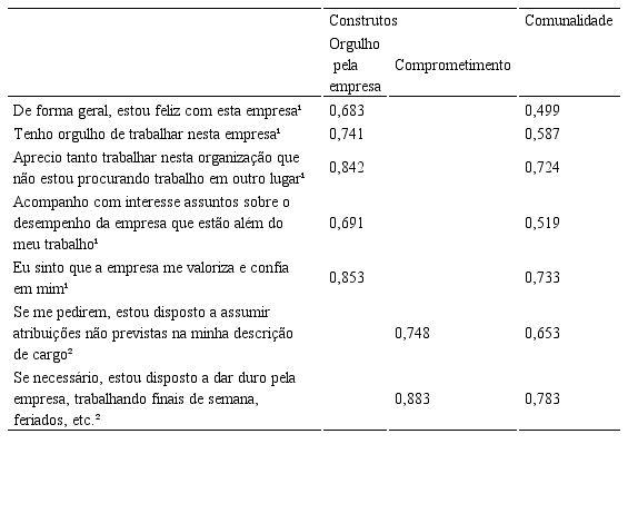 A matriz rotacionada de atitude trouxe dois fatores ou construtos. Segundo Dancey e Reidy (2006), os construtos devem ser denominados de acordo com o que melhor representam. O primeiro fator foi denominado de atitude de “orgulho pela empresa” e o outro foi denominado “comprometimento” ou atitudes de predisposição para ajudar. Vale ressaltar que aqui se faz um uso livre e espontâneo da expressão comprometimento, sem a pretensão de associá-la às pesquisas que tratam do tema. Analisando as cargas (Hair Júnior et al., 2005a) das variáveis em cada construto, além da significância de um fator em relação ao outro, observou-se que os fatores diferem conceitualmente. O construto “comprometimento” contêm as seguintes afirmações: “se me pedirem, estou disposto a assumir atribuições não previstas na minha descrição de cargo” e “se necessário, estou disposto a ‘dar duro’ pela empresa, trabalhando finais de semana, feriados, etc.”, ou seja, são indícios de atitudes de comprometimento em relação à empresa. O construto “atitude de orgulho” refere-se à felicidade, ao orgulho, à apreciação, ao interesse e à valorização, com afirmações como: “de forma geral, estou feliz com esta empresa”, “tenho orgulho de trabalhar nesta empresa”, “aprecio tanto trabalhar nesta organização que não estou procurando trabalho em outro lugar”, “acompanho com interesse assuntos sobre o desempenho da empresa que estão além do meu trabalho”, “sinto que a empresa me valoriza e confia em mim” etc. Todas as sete questões foram enquadradas nos dois construtos encontrados. Nenhuma foi eliminada, visto que nenhuma delas apresentou carga fatorial menor que 0,4. O construto “orgulho pela empresa” representa 61,4% da variância, já o construto “comprometimento” representa 71,8%. Os construtos da variável atitude foram criados a partir da média dos itens que os compunham.