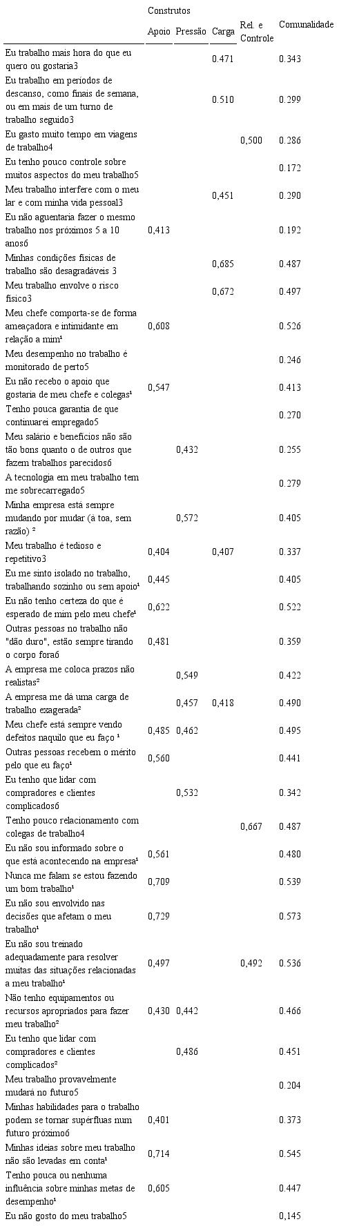 A nomeação dos 4 construtos de percepção seguiu normas e procedimentos descritos em Hair Júnior et al. (2005a), quais sejam: dar significado a cada fator, sendo que o padrão de cargas e variáveis com cargas maiores influenciam a seleção do nome. Assim sendo, os construtos foram nomeados da seguinte maneira: percepção negativa em relação ao apoio (fator 1), percepção negativa em relação à pressão (fator 2), percepção negativa em relação à carga (fator 3) e percepção negativa em relação a relacionamentos e controle sobre o trabalho (fator 4). A Tabela 2 apresenta o construto no qual cada alternativa se enquadrou. Os construtos da variável percepção foram criados a partir da média dos itens que os compunham.