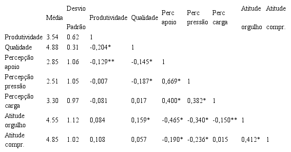 · A percepção negativa do trabalho em relação à pressão está inversamente proporcional à qualidade (hipótese 8) e a atitude de orgulho com relação à empresa está diretamente correlacionada com a qualidade (hipótese 2).