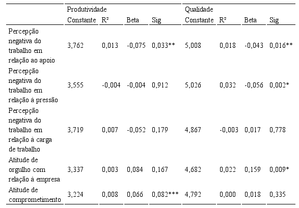 De acordo com a Tabela 4, foram encontradas algumas regressões significativas, sendo duas ao nível de 1% (percepção negativa do trabalho em relação à pressão e qualidade – H8; atitude de orgulho com relação à empresa e qualidade – H2), duas ao nível de 5% (percepção negativa do trabalho em relação ao apoio e produtividade – H5; percepção negativa do trabalho em relação ao apoio e qualidade- H6) e uma ao nível de 10% (atitude de comprometimento com relação à empresa e produtividade – H3).