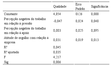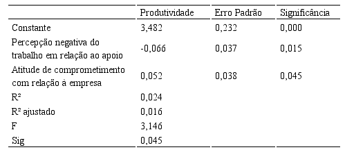 Com base nas regressões lineares simples realizadas com todas as variáveis, foram realizadas duas regressões lineares múltiplas baseadas nas variáveis que se mostraram significativas, uma para relacionar as variáveis de atitude e percepção com produtividade e outra para relacionar a atitude e a percepção com qualidade. A Tabela 5 mostra uma regressão múltipla entre as variáveis independentes e a produtividade. Foi utilizado o método Enter (Field, 2009) conforme recomendam Cunha e Coelho (2009). A percepção negativa do trabalho em relação à pressão correlaciona-se negativamente com a produtividade, corroborando a hipótese 5. A hipótese 3 também foi corroborada, pois a atitude de comprometimento com relação à empresa está positivamente relacionada com a produtividade.