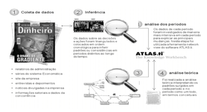 Seguindo essa metodologia, foram selecionados 1472 documentos principalmente secundários, levantados de publicações de mercado, dissertações e artigos, mapeados no Atlas.ti. Estavam incluídos entre os documentos 10 relatórios de administração e 4 entrevistas. Esses documentos primários foram carregados no Atlas.ti. Deles foram selecionados e codificados os elementos e verificadas as relações interpretadas pelos autores, normalmente, antecedentes, causas, sintomas, ações e efeitos relacionados ao declínio. Estes, com o auxílio de esquemas (network views), foram apresentados na forma de representações gráficas, como a apresentada na Figura 2, mais a frente. O procedimento segue a sugestão de Corbin e Strauss (2008) para uma teoria substantiva (grounded), a partir da qual algumas proposições foram sugeridas.