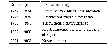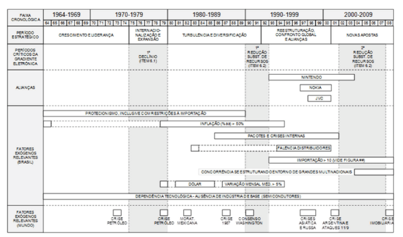 A análise dos dados organizados no software Atlas.ti permitiu inferir padrões e consistências que levaram à delimitação de cinco períodos compreendidos entre 1964 (ano da fundação da Gradiente) e 2008 (ano considerado de término da pesquisa), identificados no Quadro 2.