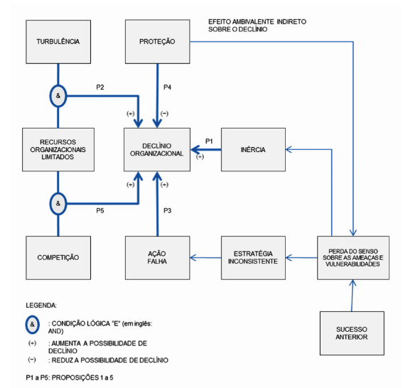 No modelo apresentado na Figura 6, as setas mais escuras estão relacionadas com as proposições e partem de elementos relacionados diretamente com essas proposições e com o declínio organizacional (turbulência, recursos organizacionais limitados, competição, proteção, ação falha e inércia), enquanto as setas mais claras estão relacionadas com elementos acessórios que visam a explicar os elementos diretamente relacionados com as proposições (sucesso anterior, perda de senso sobre as ameaças e vulnerabilidades e estratégia inconsistente). Os itens a seguir explicam o modelo com base nos elementos diretamente relacionados com as proposições.