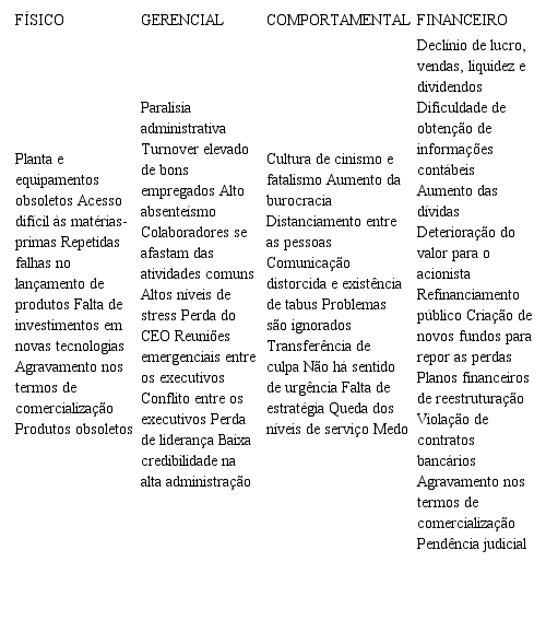 Mckiernan (2003) classificou os sintomas comuns de declínio em quatro categorias: físicos, gerenciais, comportamentais e financeiros, conforme apresentados no Quadro 1.
