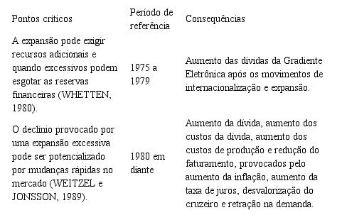 Segundo Greiner (1972), os estágios de crise podem ocorrer após cada período de expansão da organização. Analisando as quatro situações ocorridas entre 1975 e 1983, é razoável inferir que o declínio da Gradiente ocorreu durante o período estratégico “Internacionalização e expansão”, entre 1975 e 1979. Esse declínio foi agravado pelos eventos econômicos e mercadológicos ocorridos entre 1980 e 1983, que produziram o crescimento da dívida contraída durante a fase de internacionalização e expansão e a queda das vendas pela retração da demanda. Dois pontos críticos podem ser observados na Gradiente durante e após o período estratégico “Internacionalização e expansão” (Quadro 4).